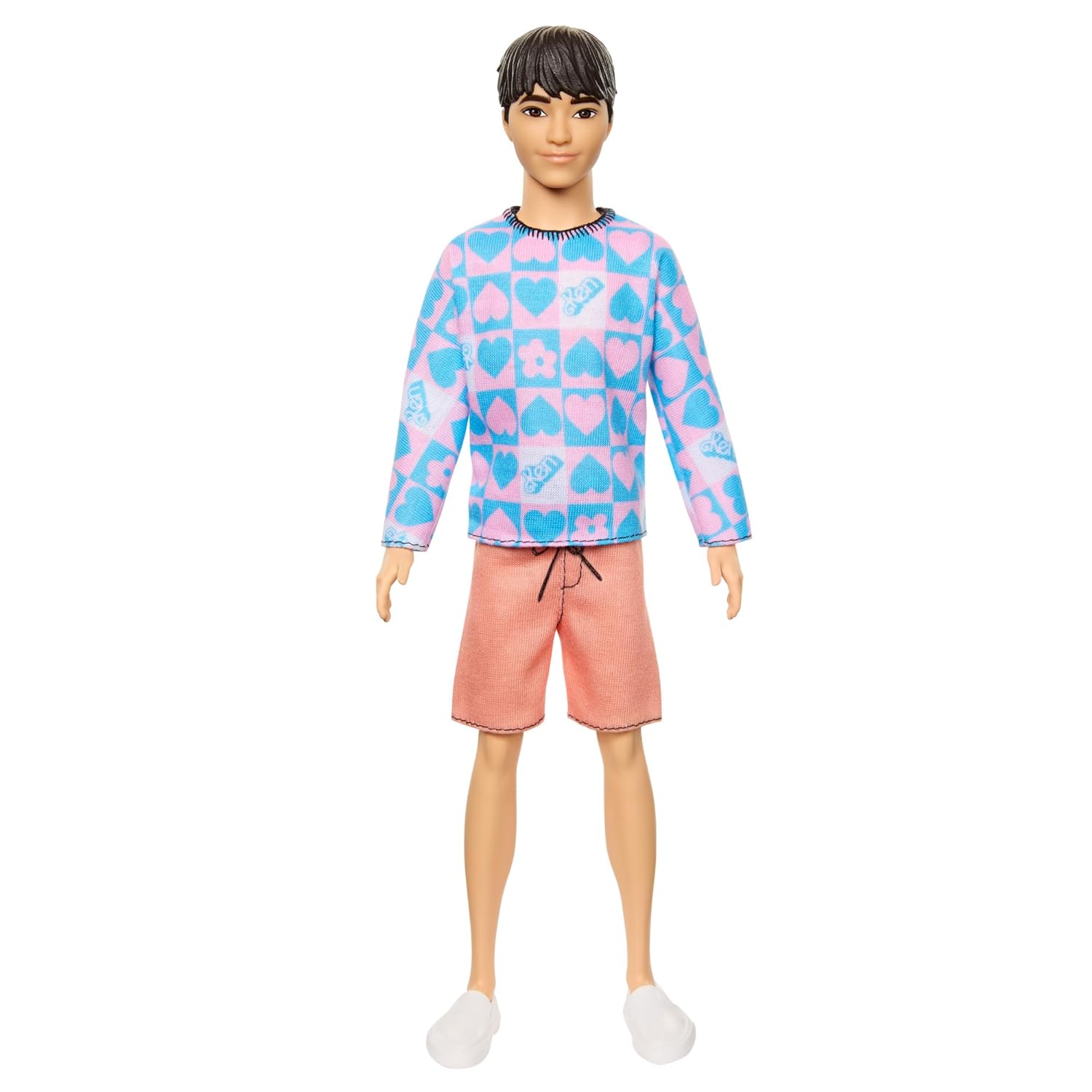 - Ken fashion doll wears a colorful patterned shirt with trendy hearts, flowers and Ken logo, paired with peach shorts.