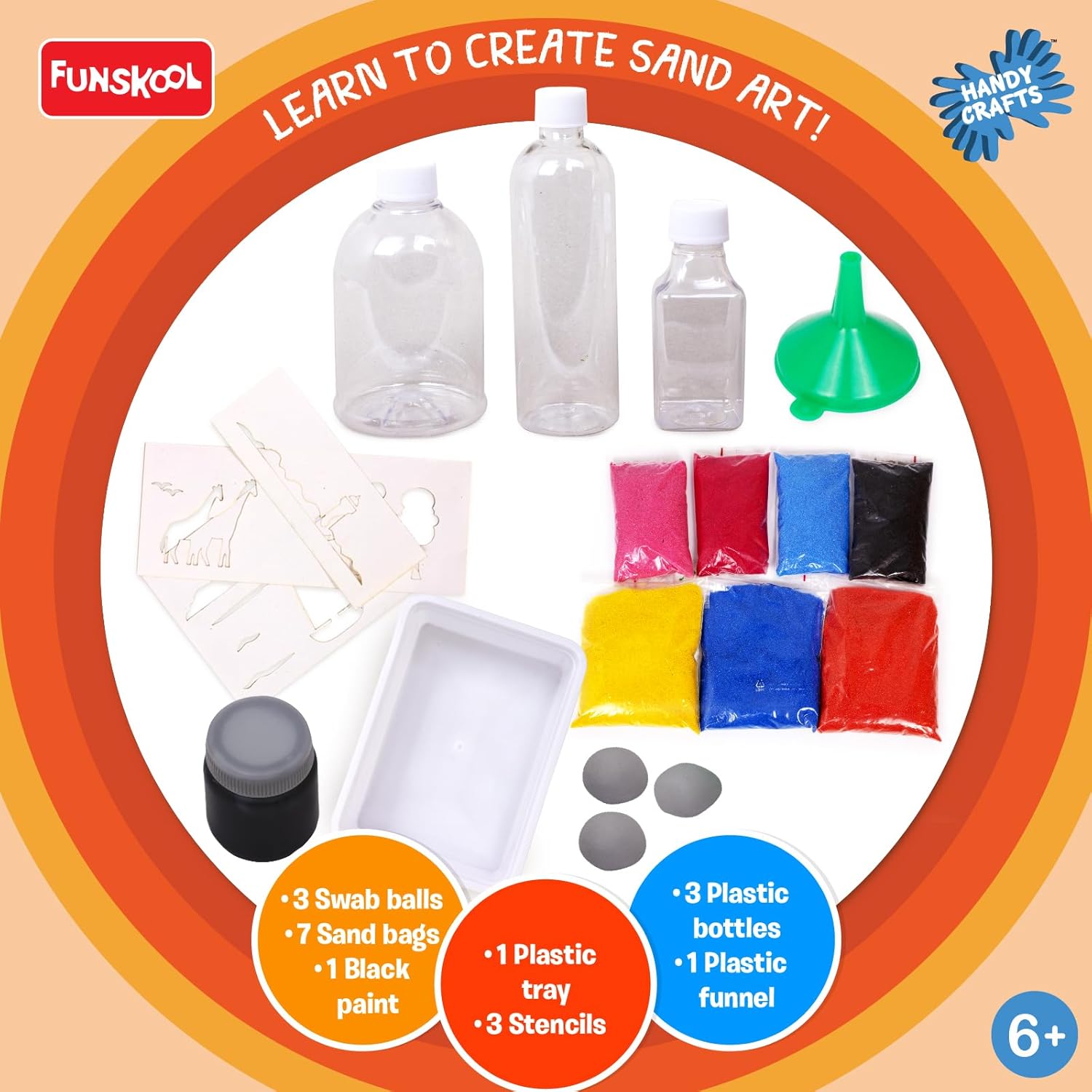 - Comes with 7 coloured sand packets, black paint and swabs