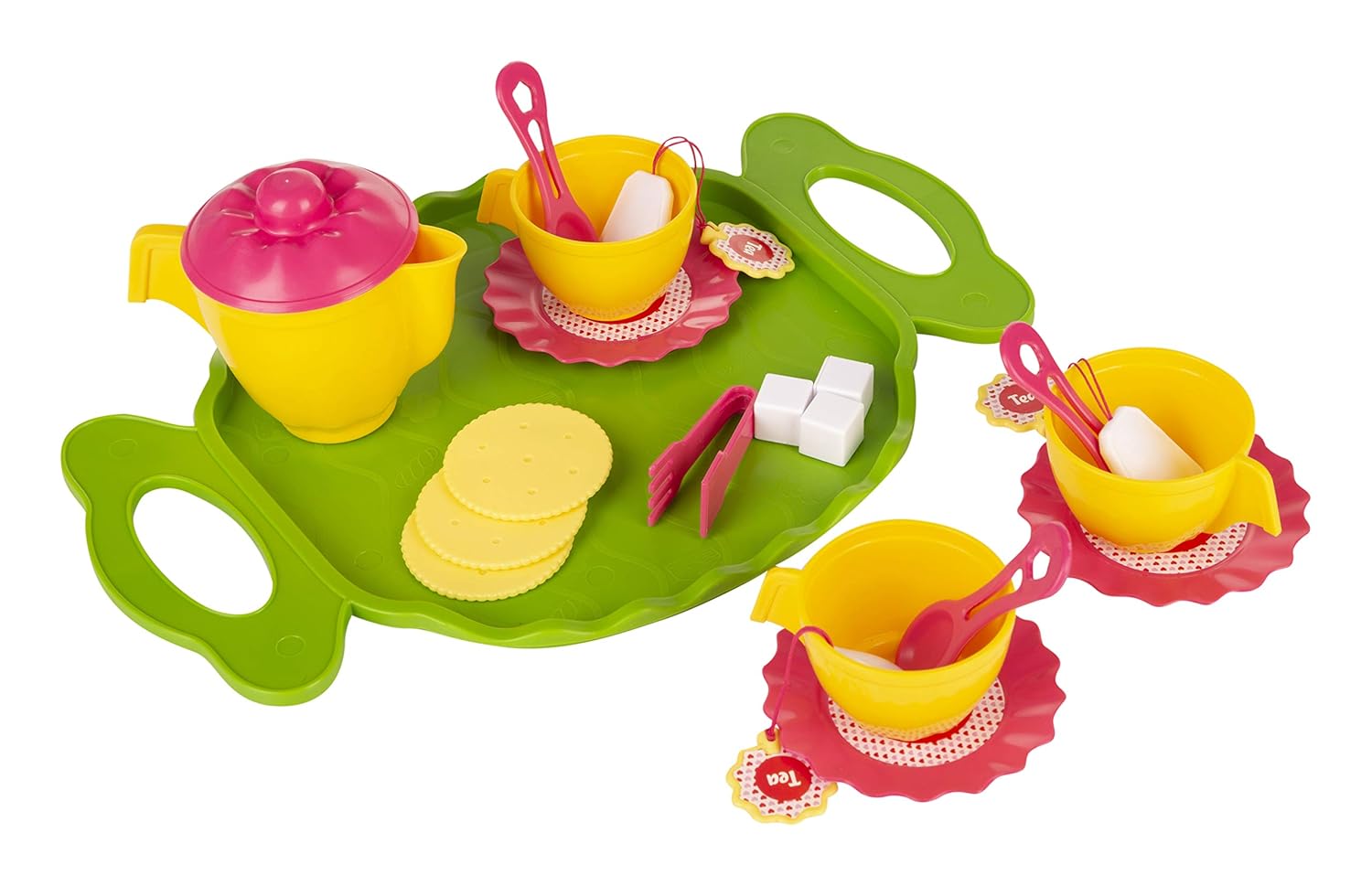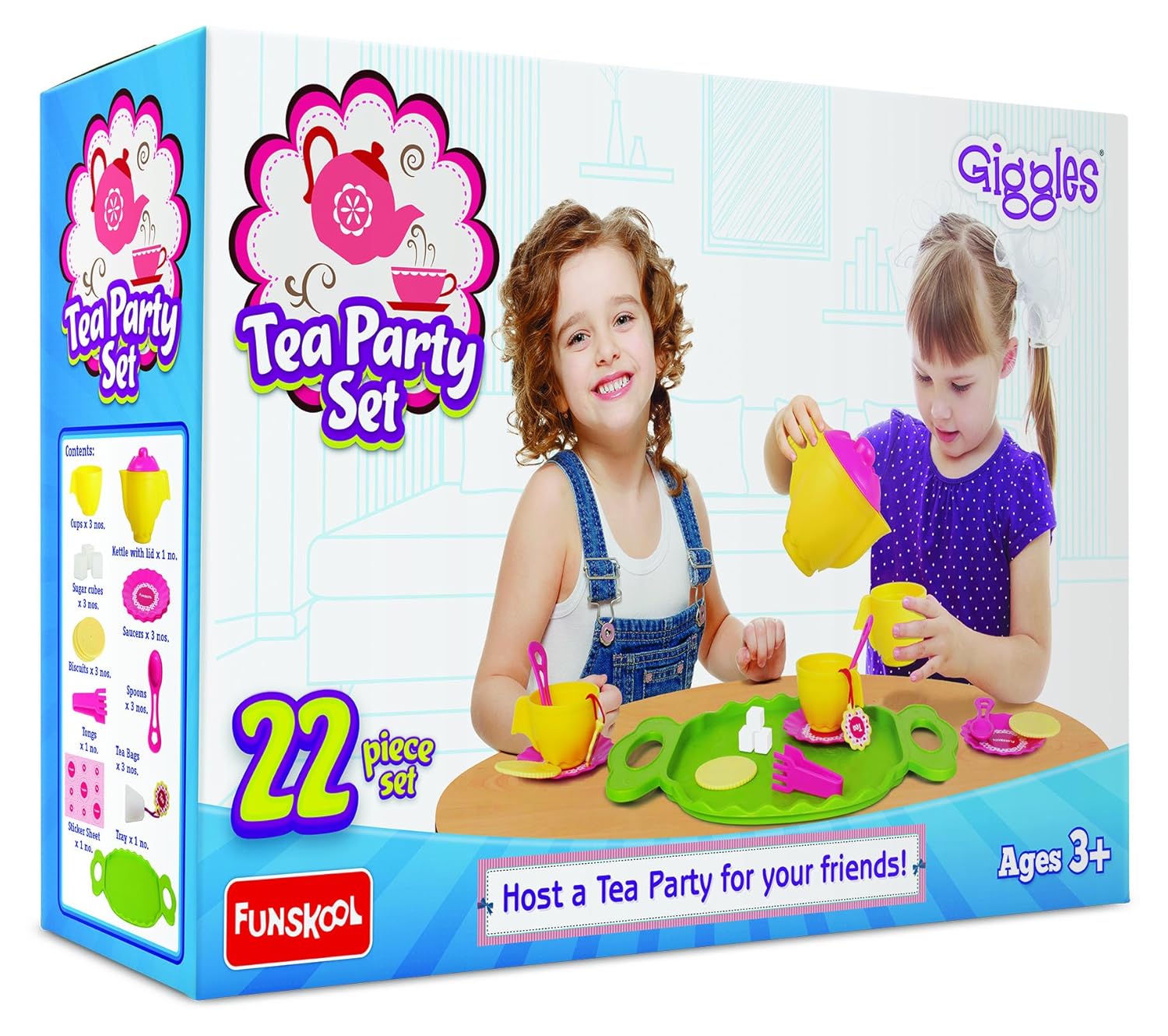 - Funskool tea party set comes with a tea tray, teapot, teapot lid, sugar cubes with lid, 3 cups, 3 saucers and 3 spoons