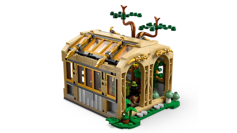 - Hogwarts™ playset – The buildable greenhouse opens up for easy play and features 2 removable tables covered with magical plants, a tree poking through a ’broken’ window and gardening accessories