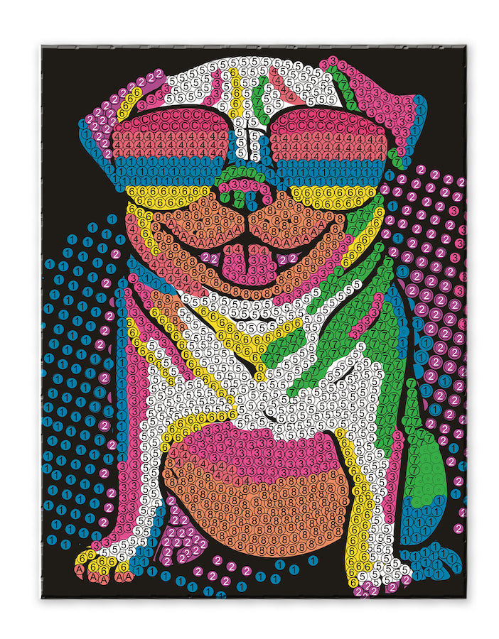 Sequin art is the hottest new craft trend, joining crystal art in popularity! Super simple and highly rewarding, this addictive art is a fun mix of painting by numbers, cross-stitch, mosaics and crystal craft. This cool pug pic is fun for kids to make, and is perfect for framing and displaying!