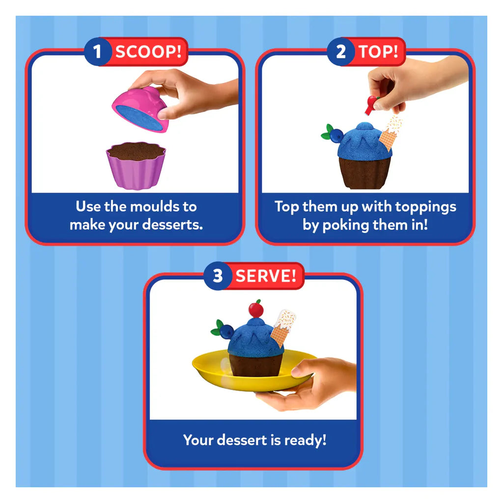 Build, decorate, and serve endless delicious treats with the SANDEEZY Delicious Desserts Set! With 3 vibrant sand colours, 6 dessert moulds, and 20+ toppings, kids can run their own pretend dessert shop for hours of creative, sensory play.